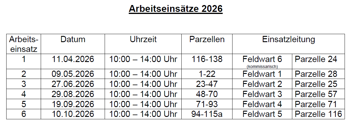 Bitte denken Sie im Verhinderungsfall, sich eine/n Tauschpartner:in zu suchen. Sollten Sie Ihren Arbeitstermin nicht wahrnehmen können, bitten wir um rechtzeitige Information (an den Feldwart oder den Vorstand).